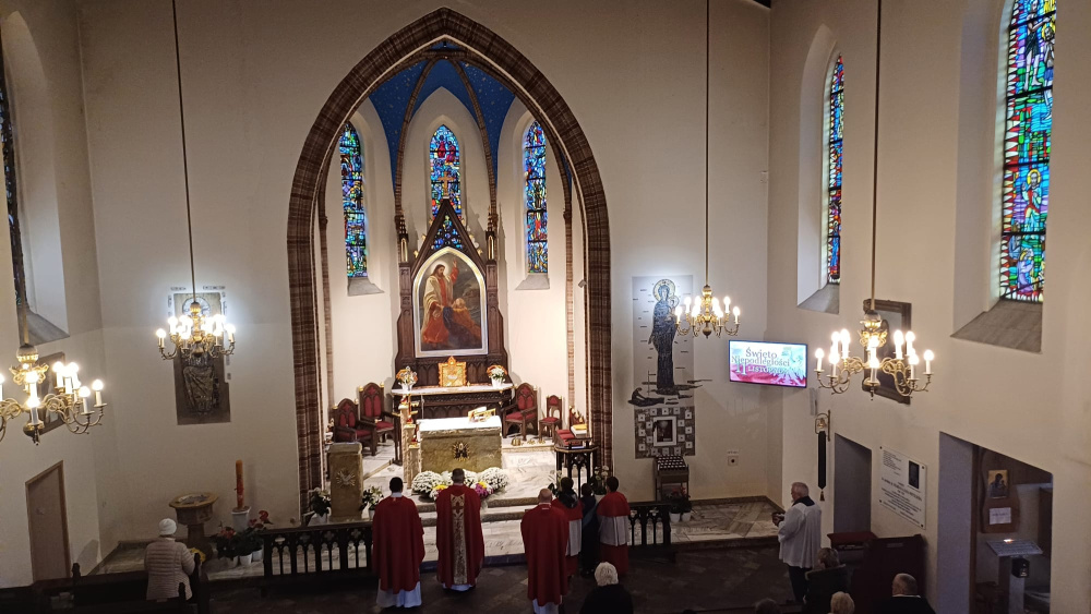 W prezbiterium rozbrzmiewały pieśni patriotyczne i modlitwy za Ojczyznę, a piękne wnętrze kościoła – ozdobione kwiatami i blaskiem świec – podkreślało podniosły charakter wydarzenia.
